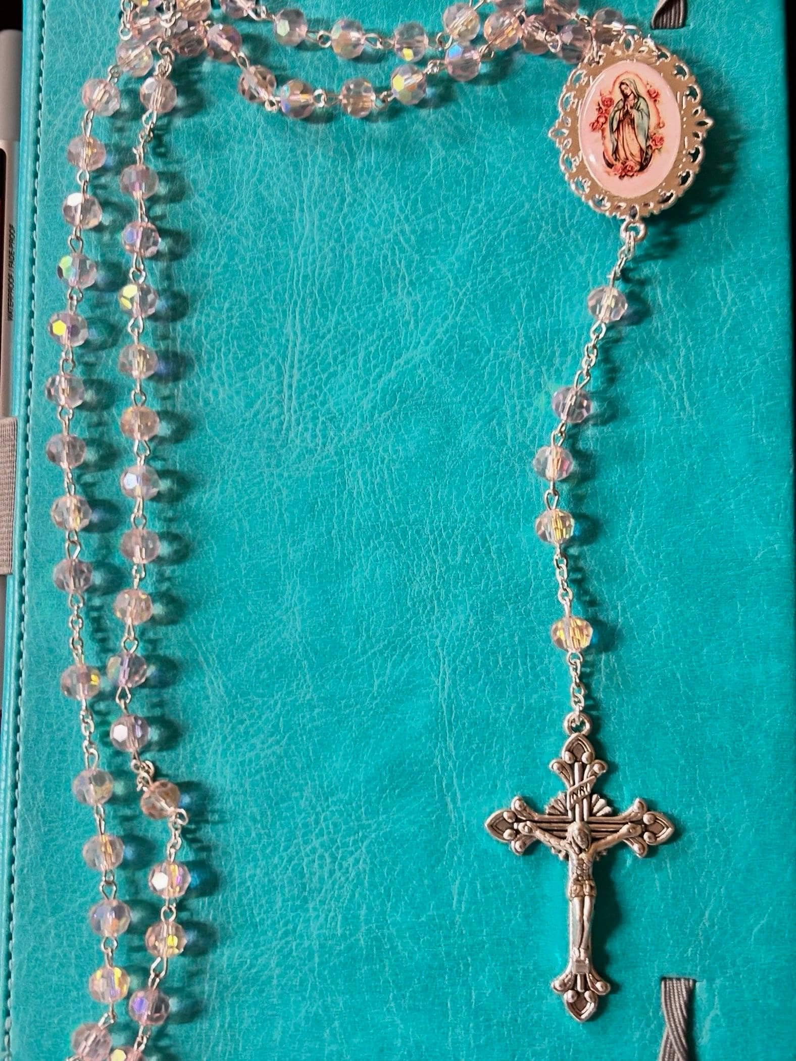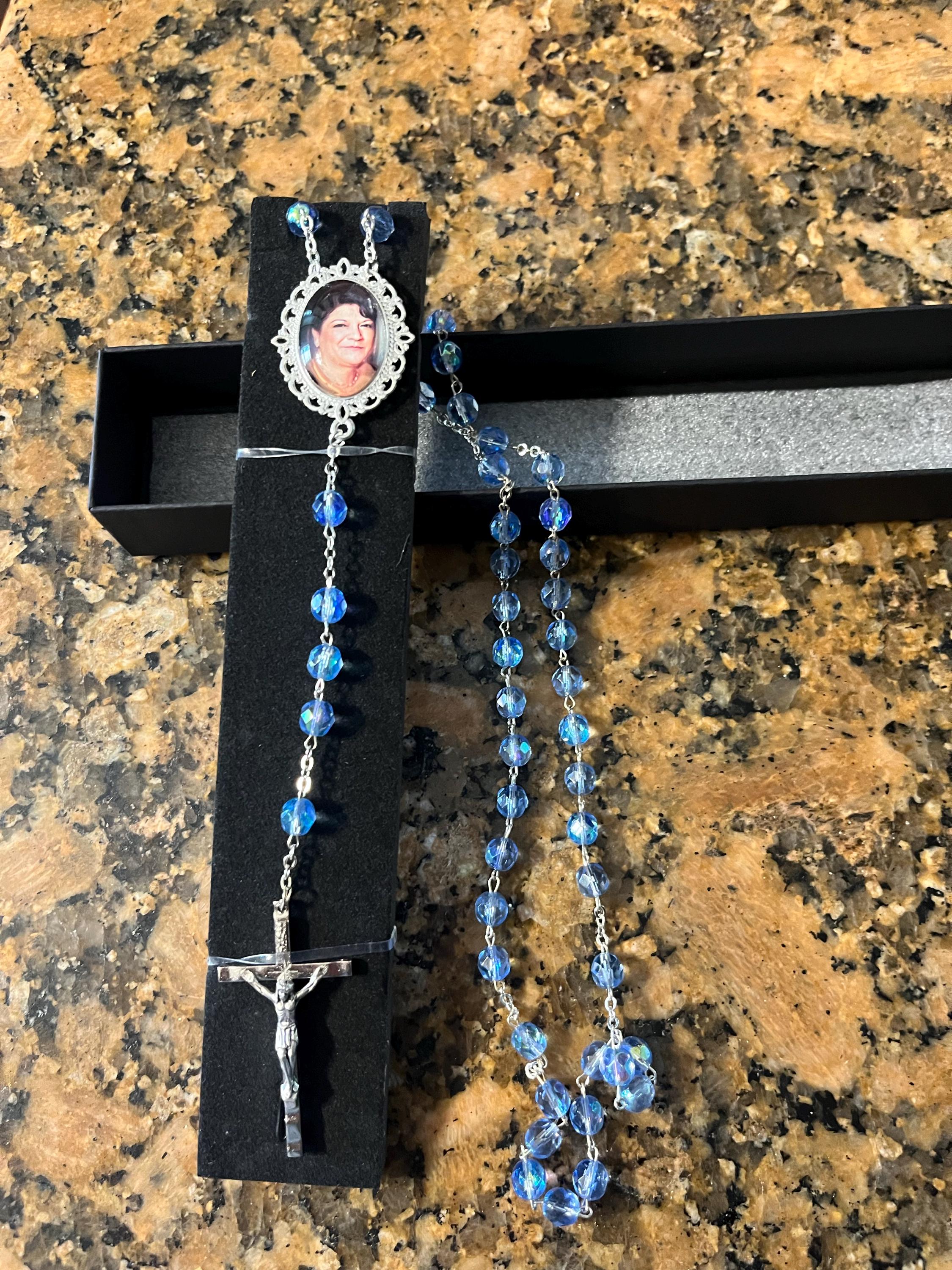 This handcrafted Pink AB Crystal Rosary is more than prayer beads... it’s a keepsake filled with love, memory, and devotion. Designed with faceted pink aurora borealis glass beads that softly reflect the light, this rosary is personalized with your cherished photo placed in an ornate silver-tone centerpiece and sealed beneath a protective glass dome.