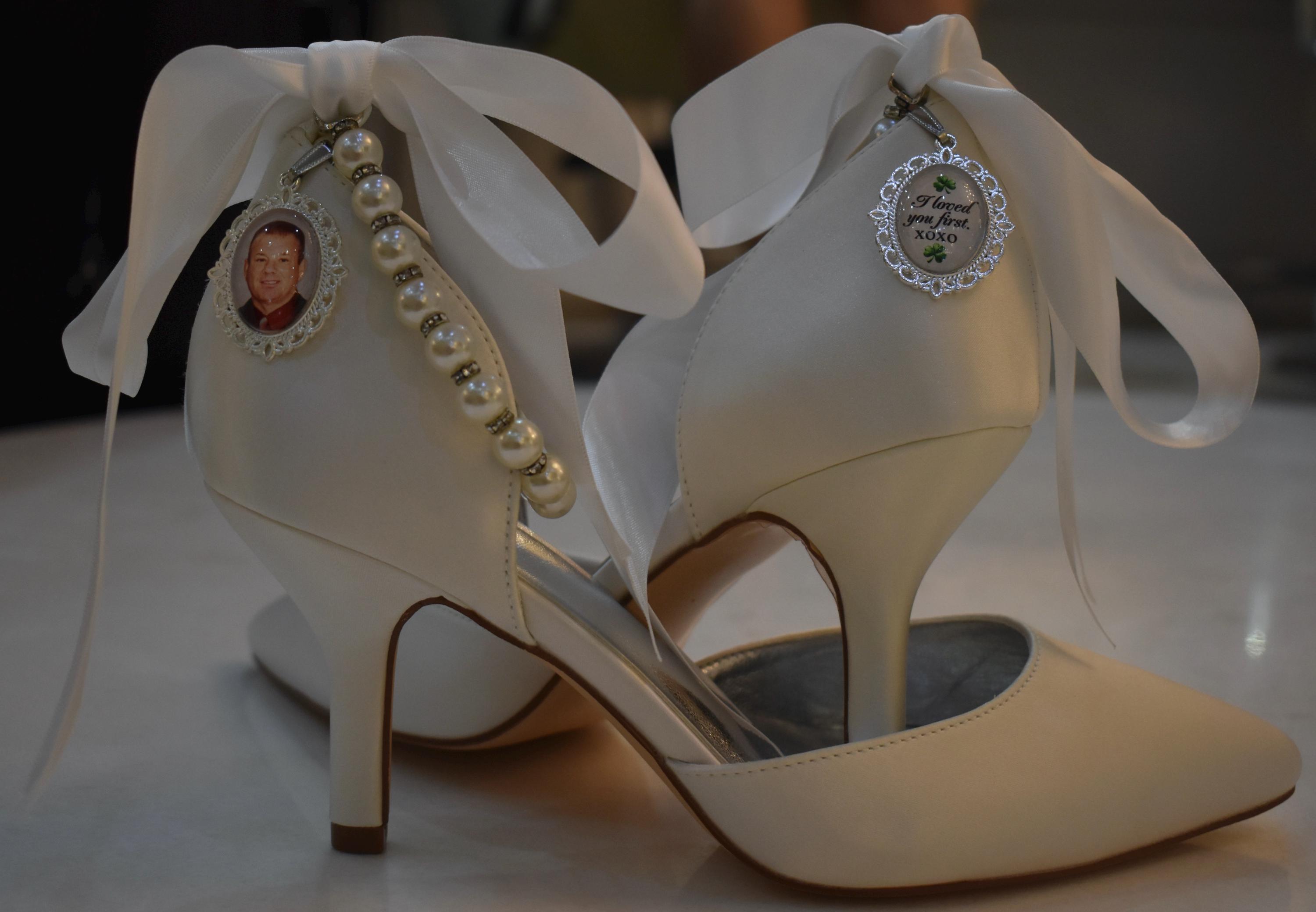 These beautiful memorial shoe charms attached to your bridal shoes with pinch bails (included with your purchase). You simply "pinch" tightly on the back (or front) of your shoes, or even place them on the sides of the shoe (towards back). Works with most style shoes, including flats, as well. Please note… that the pinch bails can create small pin holes to your shoes, so only do this if you are aware of this possibility).