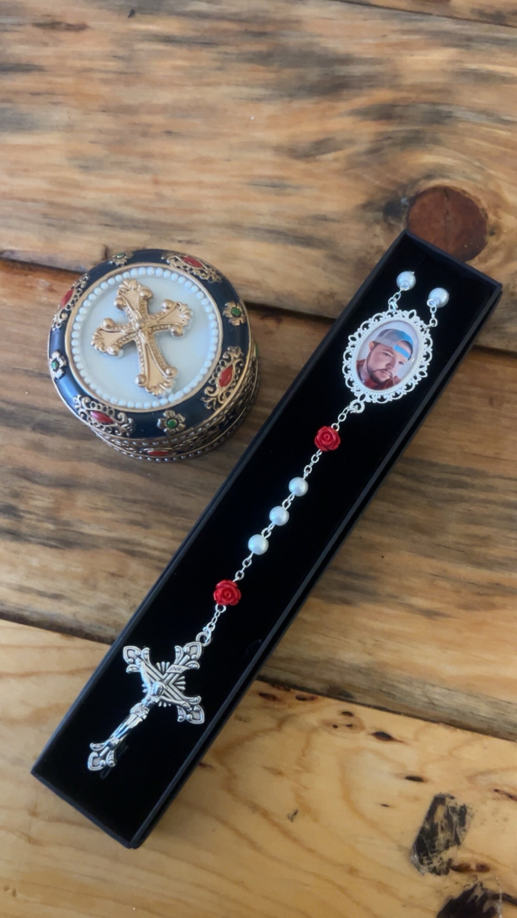 These beautiful White Rosaries, accented with red roses are handmade with YOUR favorite photo which you will send to me UNCROPPED when you place your order. A second side can also be created with your special sentiment, name/date or even another photo. Another Upgraded option is our Rosary Trinket Box. This is an added item (sold separately) as you will see in drop-down menu when you place your order. Each set of rosary beads are beautifully displayed inside an elegant black felt-lined gift box which is INCLUDED with your purchase.