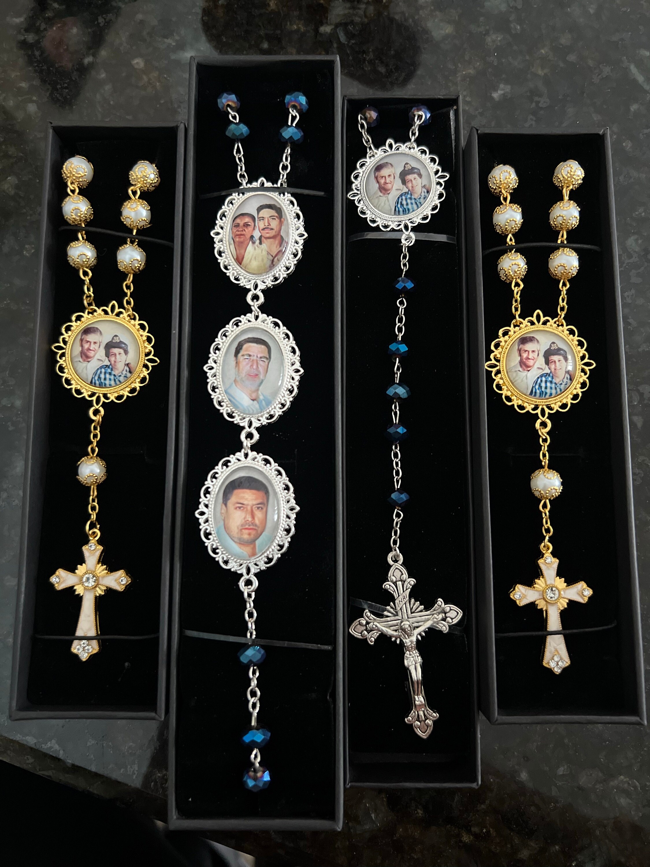 To order this custom rosary, simply select the design you love, along with any add-on options from the “Options” drop-down menu. We also offer double sided as another option, so you can add a personalized message or text (on back) of your rosary charm, making it a truly one-of-a-kind spiritual keepsake. Please be sure to upload your “uncropped” photo right after you place order. I will carefully resize, restore, enhance, when necessary (no extra charge) and adjust your image to fit the rosary charm perfectly. Don’t worry…You will get a digital proof before assembly starts for your approval.