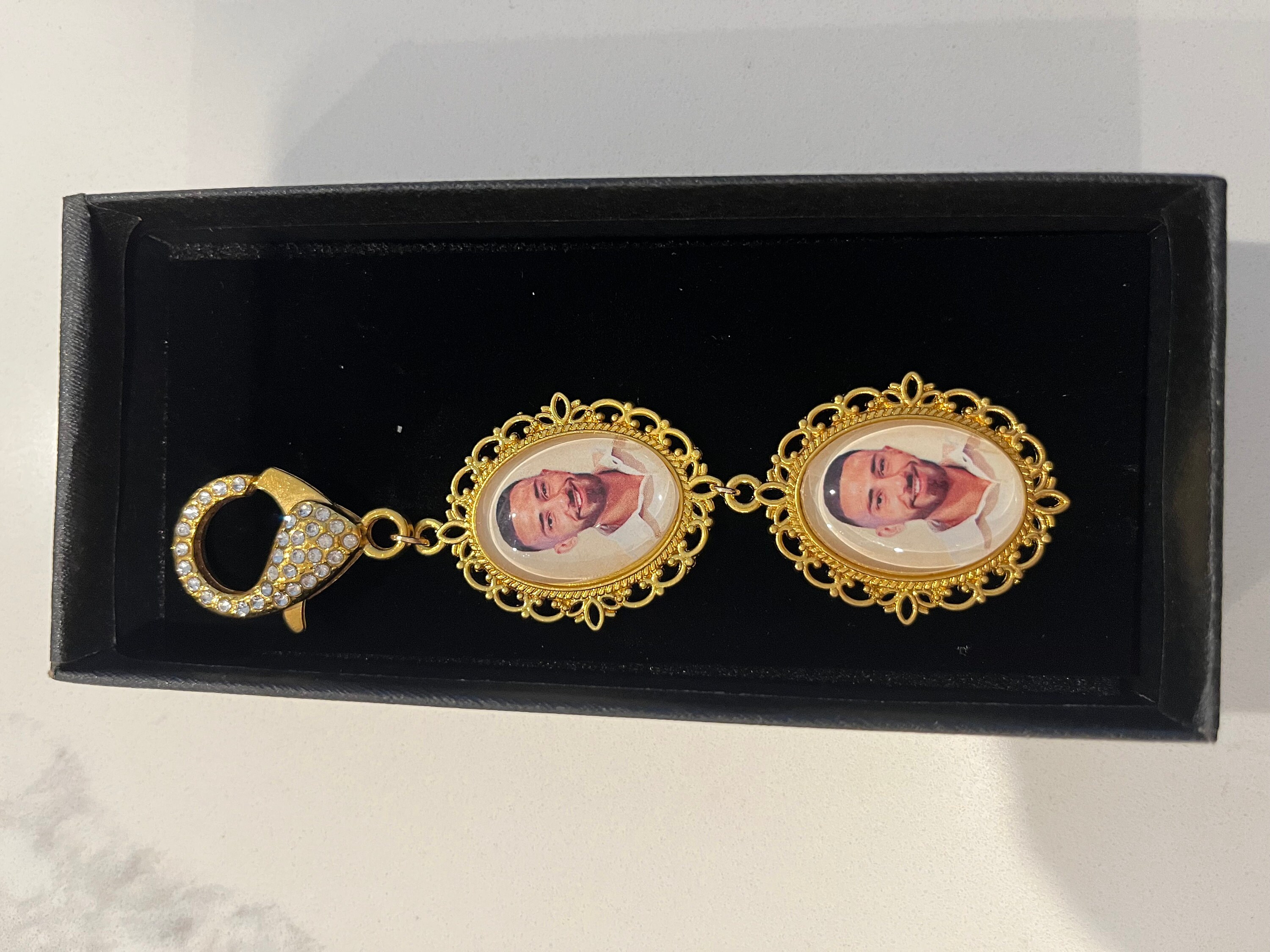 Having your personalized picture incorporated into this charm is a beautiful way to keep a loved one close in spirit on your Special Day. It is a unique memorial charm unlike any other. You can combine your photo with a sentiment of your choice or include a second different photo.