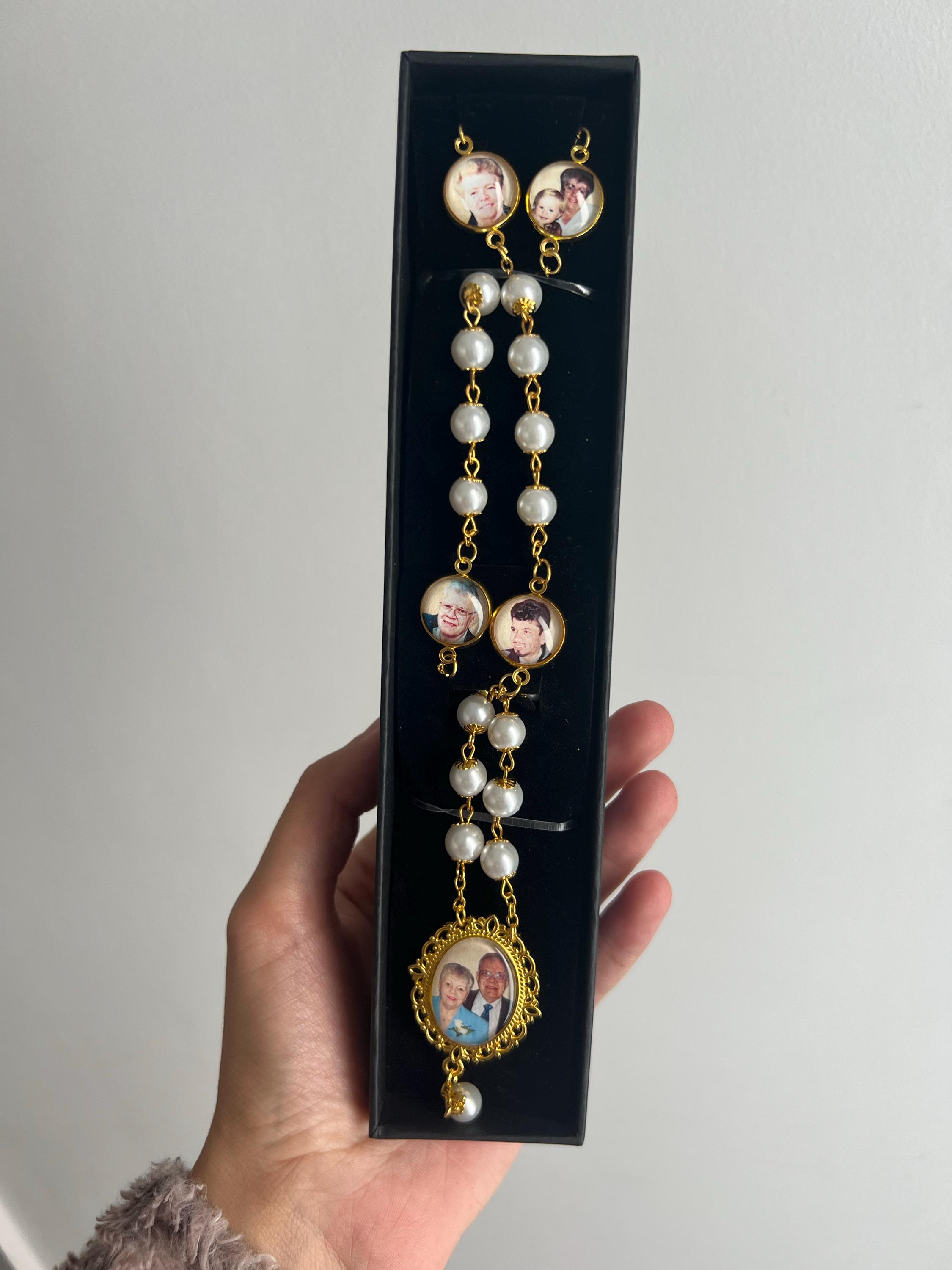 A handcrafted rosary with 5 photo “beads” … perfect for honoring the memory or presence of loved ones. A gift of prayer, comfort, and connection