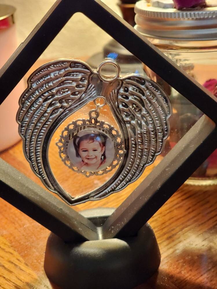 This personalized Photo Angel Wing Ornament is sure to make a lasting impression and warm the hearts of many. Can be displayed in your car on the rear view mirror. Or during Christmas, hang it on your tree. A great way to say “You are loved and remembered in a special way” for any “angel” you love in your life, who are currently with you and for those who have departed.