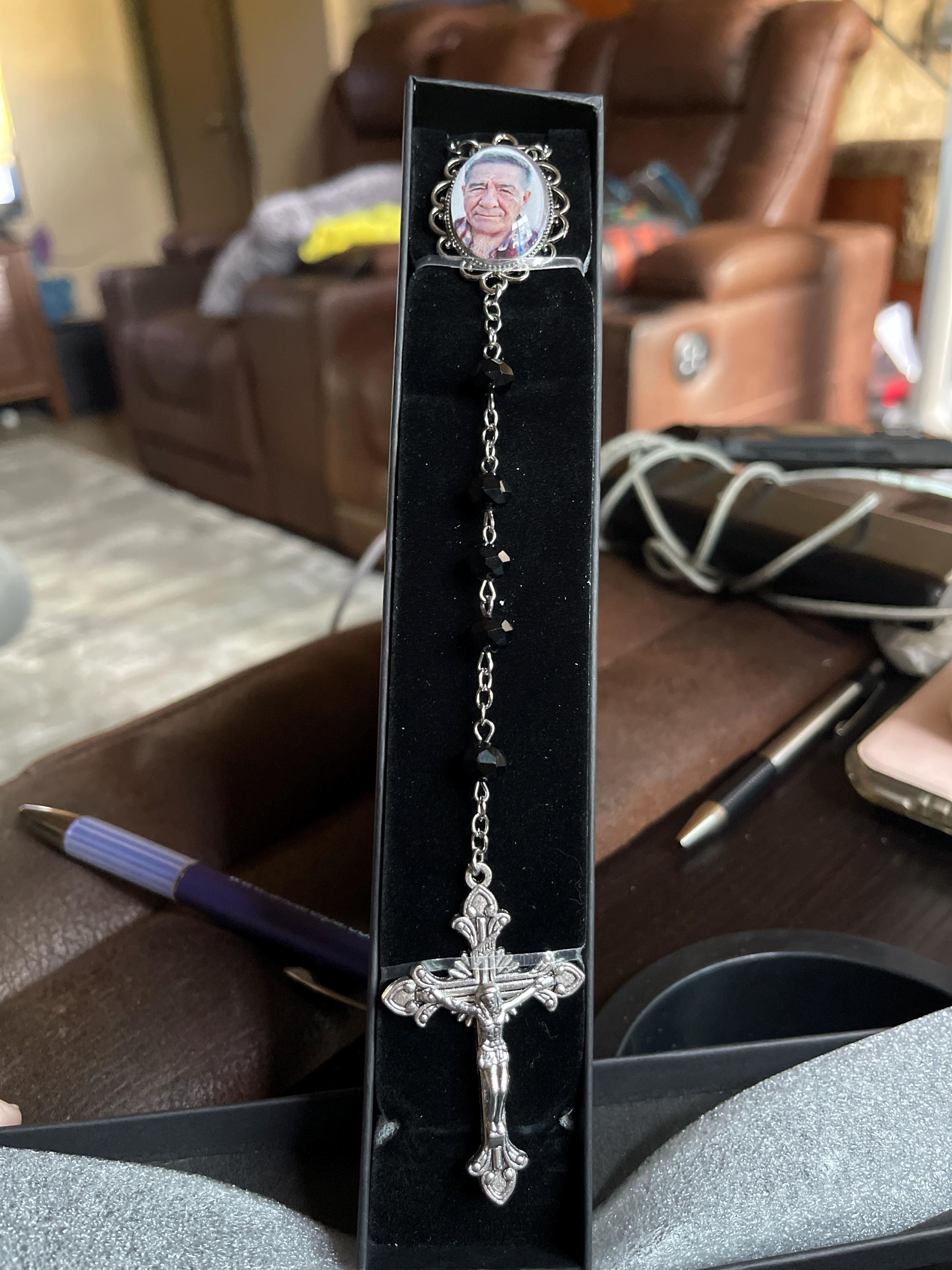 These beautiful BLACK Crystal Rosary Beads are recreated by me, with YOUR photo. surely will become a treasured heirloom. This Rosary can also be worn as a necklace. Makes an awesome and memorable gift which has become a favorite keepsake for family & friends. A symbolic & thoughtful gift of hope and prayer to those you love and for any occasion.