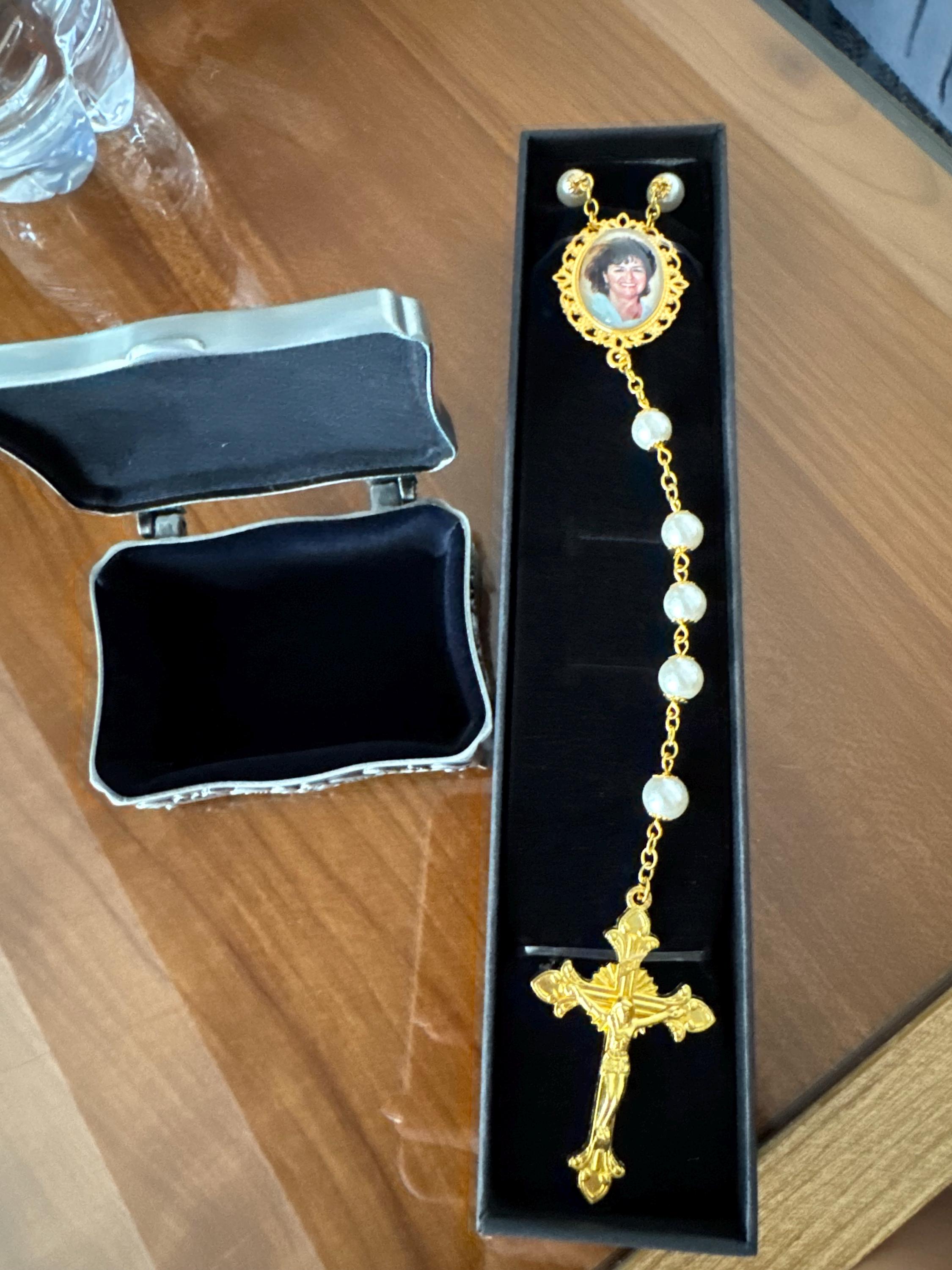 This beautifully handcrafted rosary features radiant pearl-capped beads, gold-tone accents, and a personalized photo charm...creating a one-of-a-kind memorial that honors your loved one in prayerful elegance. Whether gifted or kept close, this keepsake offers comfort, beauty, and enduring devotion.